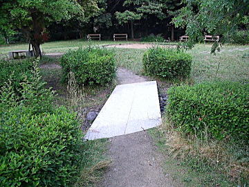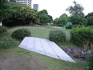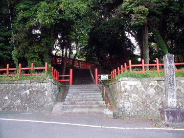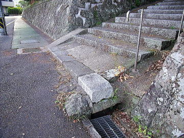 | 金印が出土したことで有名な志賀島。学生の頃一度訪れたような記憶があるのだが、もう40年以上も前の話、定かではない。ここの神社参道に石アーチが有ると言う。確かに参道を登って行くとアーチはある。しかし、悲しいかなヨレヨレである。完全に輪石だけの珍しいアーチなのだが、現状は下からの支柱によって支えられていると言う危機的状況である。6年前に撮影された写真には支柱は写っていないので、比較的新しい施工と言うことが分かる。おそろく、微妙にアーチ基礎部が広がっているのだと思われる。いつの時点かで、一旦解体して基礎部をガッチリと固め、組み直すと言うことを行えば、再度支柱無しできれいなアーチを描くことができるのではないかと思われる。尚、参道階段下入り口には細溝が潜っており、黒い大きな自然石が顔を出していた。そもそもの入口の橋の一部と思われる。 |