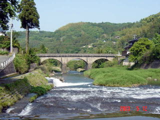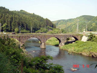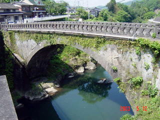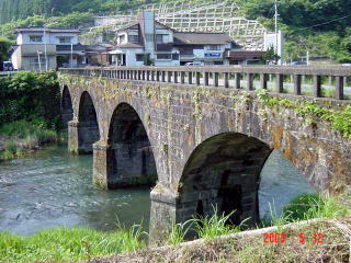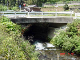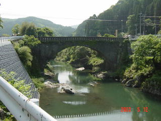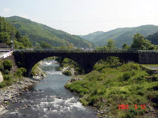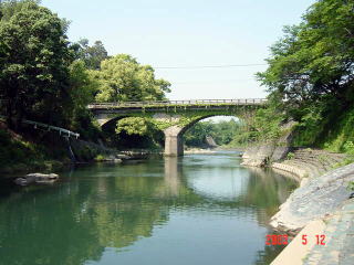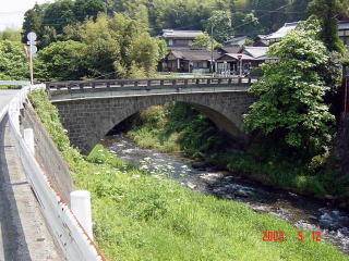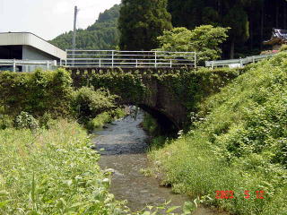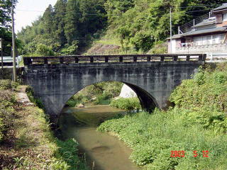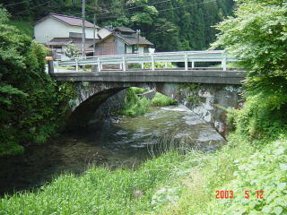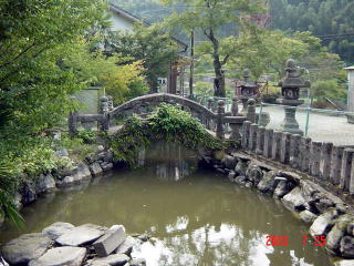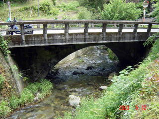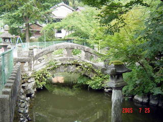 3度目の正直でやっと巡り会えた。急傾斜地であること、鳥居が目線より高い位置にあること、村道から天満宮の建物が見えないこと等が理由に挙げられる。なーんだという場所にあった。R70を登って行って納又の集落を出外れる辺りから左手村道に左折、直ぐ右手上に階段があり、その上に天満宮の境内。建物はさらに池を越えた奥に建っている。この参道橋はどうやら桁石による太鼓橋ではなくて列記としたアーチ橋のようである。こういうのは大変珍しい。私も実際に目にしていながらアーチ橋とは気が付かなかった。擬宝珠は何故か中央には無くて合計も7つと中途半端である。 |