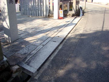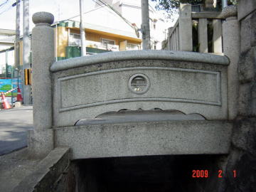 かな?と思ったが下を覗いて見て分かった。大きな御影石の一枚橋である。高欄はピカピカツルツルで立派なものである。なかなかに凝った意匠である。平べったい擬宝珠が